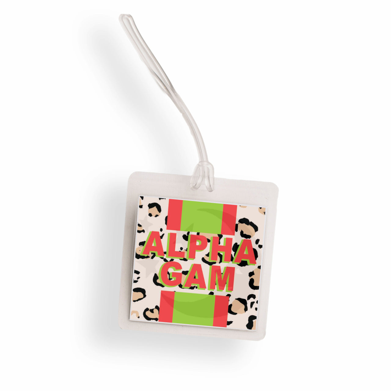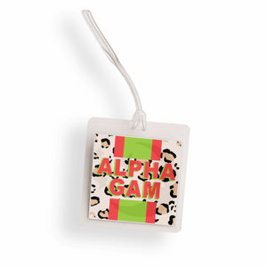 One of our most popular gift items, these custom-designed luggage tags add a special touch to your favorite tote! The front of the tag features our cheetah stripe design in sorority colors. The back features a place to write in your name and address. Laminated with hangtag.