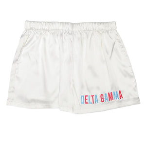 White satin is embroidered with your sorority name in your colors completed with a comfy elastic waist band and pockets.