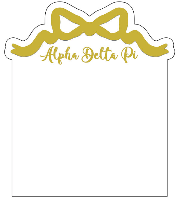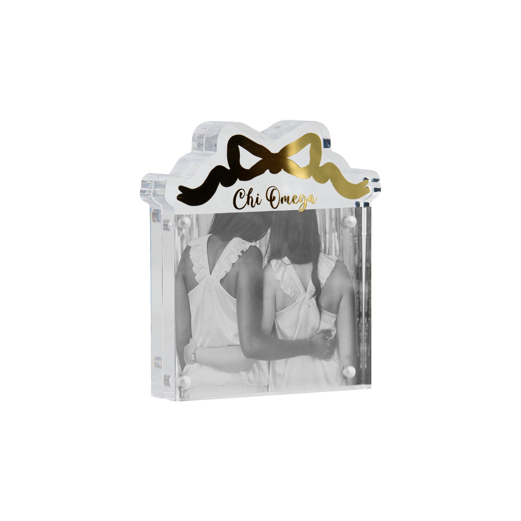 Add a playful touch to your desk or nightstand with our Sorority Acrylic Bow Frame! Featuring a chic gold bow design, this frame is perfect for showcasing your favorite memories while also showing off your sorority pride. Stand out from the crowd and add a touch of sweetness to your space with this unique frame.