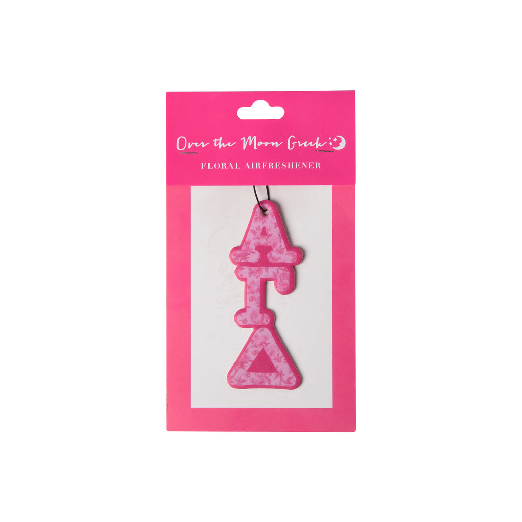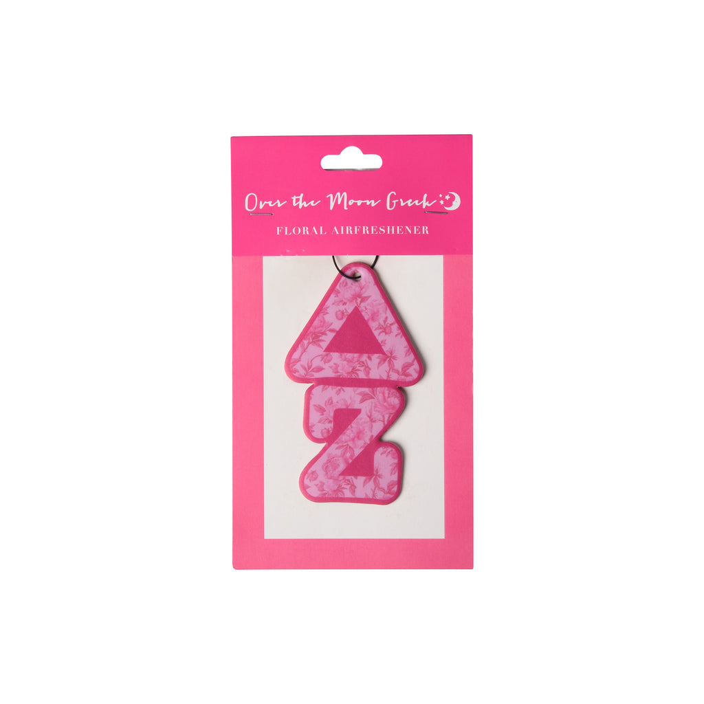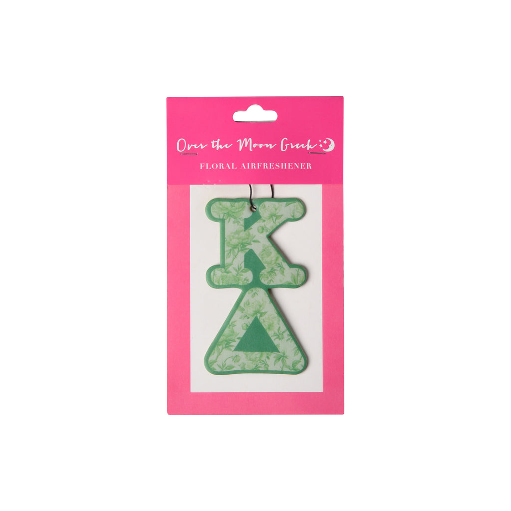 Introducing the Sorority FLORAL Air Freshener - the perfect way to bring some "fresh" to your car or room. This unique air freshener features a delicate floral scent and your sorority's greek letters, adding a touch of personality to any space. A fun and fresh way to show off your sorority pride!